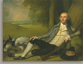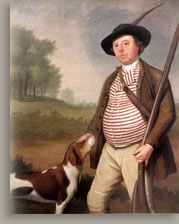 Earl had painted two images of huntsmen, Colonel George Onslow (fig. 1) and Reclining Hunter (fig. 2), before executing the work in the Worcester Art Museums collection; both of these are in a considerably smaller format than the present work. The former is a three-quarter-length depiction of a man holding a rifle and touching the neck of his brown-and-white dog, which is shown in profile. In its lines and markings, that hunters canine companion is similar to the dog behind its master in Portrait of a Man with a Gun. Onslows stout form contrasts with the lean hunter in the Worcester painting, and he appears to stride, unlike the relatively static anonymous sportsman. The landscape is loosely rendered in both paintings, though more open, hilly, and varied in its contours in the Onslow than in the Worcester portrait, with its parklike setting. Reclining Hunter is full length, though horizontal in format. In contrast to the ready acceptance of the conventions of British sporting portraiture in the other two works, this painting is a parody of the theme. This recumbent mans clothes are too fine for hunting, and he has indiscriminately shot birds not ordinarily hunted as well as a cow and a donkey. His foolishness is underscored by his self-satisfied grin. By contrast, the sober countenance and elegant but proper hunting attire of the man in the Worcester painting suggest a model of gentility.6 The figure in the Worcester painting holds a fine, up-to-date English fowling piece. According to Wallace B. Gusler, master gunsmith at Colonial Williamsburg, the rifle: