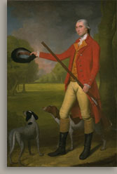 Ralph EarlPortrait of a Man with a Gun, 1784 Description The subjects powdered hair is pulled back and apparently gathered in a queue; there is a single tight curl visible above his left ear. He wears a white stock and bow and an orange, spotted waistcoat that is edged with a double row of gold braid and decorated with two rows of small gold-colored buttons. He also has on a red coat with large, silver-colored buttons. His buff-colored breeches are fastened at the knee with cloth-covered buttons of the same color and tucked into knee-high boots that are dark brown at the top and black from the calf to the toe. The man is accompanied by two hunting dogs, whose heads are turned in the direction of his gesture. The dog on the left, its back to the viewer, is placed on a diagonal from the bottom-left corner toward the middle of the image. This animal has a dark gray head and ears and a large gray spot on the back of its neck; its coat is mottled gray and white. The other dog stands in profile behind its master, its neck extended and facing left. This canine has reddish-brown markings on its head and back and a similarly spotted coat. The man and dogs appear in the clearing of a wooded landscape. Gently curving lines of trees recede along the left and right sides; a single tree stands just behind and to the right of the hunter. The sky has large gray clouds whose shapes echo the soft contours of the trees as well as broad passages of pink and blue. Although the figure of the man is rather tightly rendered compared to those in characteristic English paintings of the time, Earl used broad brushstrokes in the landscape, especially in the bush on the left and the soil in the foreground. As in Earls indoor portraits, a strong light source from the left defines the modeling and casts a web of shadows beneath the figures. Analysis The suggestion that Earl painted the portrait near Windsor is further supported, although not conclusively, by a letter he wrote at about the time Portrait of a Man with a Gun was produced. Writing to fellow Massachusetts native Dr. Joseph Trumbull in London, Earl reported, "I made your Com[pliments] to Mr West I have finished the large picture and lately finished another and half done a thirde." Since this letter was written on September 23, 1784, and the Worcester Art Museums painting is dated 1784, it is possible that this was the "large picture" to which he refers. It is certainly the most ambitious known Earl painting from that year. That he was writing from Windsor and clearly in the company of Benjamin West makes the connection even more interesting, yet still tentative.3 Portrait of a Man with a Gun belongs to a group of similar subjects Earl painted over a short span that reflects his response to contemporary English portraiture. Sporting pictures were popular in England in the seventeenth century and especially the eighteenth century. Thomas Gainsborough, Allan Ramsay, Sir Joshua Reynolds, and John Vanderbank are just a few of the prominent artists whose portraits of aristocrats hunting Earl might have seen in London.4 Elizabeth Kornhauser proposed that "British sporting art appealed to Earl for several reasons, for one, because English country gentlemen and landowners, rather than their urban counterparts, desired it."5