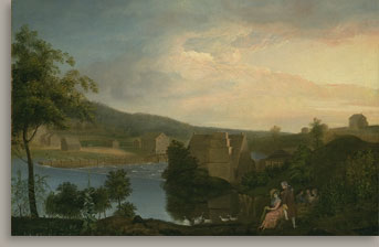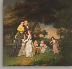 The precisely delineated setting in this family portrait hints at the artists broader interest in landscape painting. Before the 1820s, landscape was relatively rare as a subject in American painting, except in the overmantels made by decorative painters or as a background for outdoor portraits. But James was painting them by 1788, when Charles arranged to sell his own and his brothers work by raffle.19 Pleasure Party by a Mill (fig. 4) demonstrates his mastery of the picturesque mode of landscape in which nature and culture are appealingly blended.20 A well-dressedgroup in the right foreground rests near flowers and swans at the waters edge, while a mill in the distance evokes the burgeoning of American industry and prosperity.