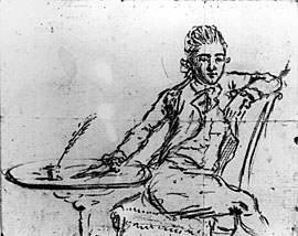Sully painted The Capture of Major André on a canvas slightly smaller than those he typically used for bust-size portraits. In the lower center, four male figures are positioned atop a hill, beneath a large tree, on a dirt road marked with wagon ruts that leads out of the painting at the lower right. A man in a mauve-colored coat is the central, and tallest, figure in the composition. Another man kneels on one knee to this figures right, another crouches behind him, and a third stands to his left. Just behind the figures, a saddled horse grazes under a large moss-covered tree, the top of which extends beyond the picture plane. The tree leans slightly to the left, and the soil around its base has eroded, exposing its roots. At the lower left are a leafy green bush and a dirt bank partially covered with dark-brown brush and green grass. A feathered hat, a musket, a black hat, and some scattered papers, including one with a torn red seal, are visible in the grass and dirt. A tree with yellow and brown leaves appears above the dirt bank at the left. Beyond it, water flows in a chasm above which stretch hills, blue-gray mountains, and billowing smoke mingled with pink-edged clouds in a blue sky. Darker clouds show through breaks in the foliage at the upper right. Three of the four men are dressed almost identically in what appears to be a uniform: brown shoes with silver buckles, long olive-green trousers with slits at the cuff and a matching short coat, powder horns, white shirts, and tan hats with feathers. The man crouching behind the figure in the mauve coat does not wear a neck cloth, and his shirt is unbuttoned. Only the kneeling man has placed his hat and musket on the ground. In addition to the long mauve coat, lined with gray silk and trimmed with gold braid and gold buttons, the central figure wears a ruffled white shirt, white stockings, ivory breeches, and a matching waistcoat. On his left foot he wears a black boot trimmed with tan; the kneeling man holds his other boot. He wears a powdered queue wig. Sully carefully delineated his figures facial expressions and gestures. The kneeling man looks up in disbelief at the central figure from the spilled contents of the boot. His mouth is slightly open, and his left hand is extended; perhaps he is asking a question. The crouching figure is hunched over, intently reading a document he holds in both hands. The figure in mauve holds a watch in the palm of his right hand and has placed his left hand on the shoulder of the uniformed man standing at his right. Frowning and ignoring the extended watch, the uniformed man gazes outward and upward; he holds a gun in his left hand and clutches papers in his right hand. The two standing figures appear to be in a spotlight, although the brim of the uniformed mans hat shadows his face. Light coming from the upper left casts shadows from these two standing men. Only the face of the kneeling man is lit, and his body is in shadow, as is the crouching man slightly behind him. The brightest areas of the painting are the mauve coat, ivory breeches and waistcoat, and white ruffled shirt of the central figure, as well as the dirt road. The underdrawing is extensive. Working in pencil, Sully first sketched the figures and elements of the landscape background on the canvas. On top of this drawing, he laid down a thin, semitransparent layer of earth-colored paint. He built up the composition with semitransparent paint layers of varying colors but did not completely cover the underdrawing. For instance, the black outline of the nose, lips, and eyes of the standing uniformed figure is visible beneath a layer of flesh color. Sully applied opaque paint and impasto on the green mossy bark and the yellow-green leaves of the large tree. Near the base of the leaning tree, he signed the canvas with his cipher "TS," followed by the year, "1812." Biography When the three militiamen stopped André, he was in neutral territory, near the British line but not out of danger. Joshua Hett Smith had guided the major to Pines Bridge and explained to him that anyone in the neutral territory with property such as horses or other livestock was vulnerable to attack by plundering groups of loyalist "cowboys" or "patriot" skinners.2 Instead of immediately showing his pass from Arnold, André, who thought the three men were Loyalists, unwisely revealed that he was the adjutant general to Sir Henry Clinton, commander-in-chief of the British forces in North America. Supposedly, John Paulding, the groups leader and a recent escapee from a British prison in New York, was wearing a borrowed green-and-red uniform coat of a Hessian soldier. When André realized his mistake, he belatedly tried to show his pass, but the militiamen were suspicious, searched him, and found the West Point-related documents in his stocking. André was given a military trial in Tappan, New York, sentenced to death, and hung on October 2, 1780. Although some contemporary accounts of the execution express regret about his death, the despised traitor Arnold, who had been alerted to Andrés capture in time to escape, received no sympathy. He was hung and burned in effigy, but his behavior during imprisonment won him praise.3 A witness to the events, Caleb Gibbs, recorded in his diary that the Englishmans final request was that "all the gentlemen present bear witness that he died like a brave man& did."4 Benjamin Tallmadge, one of Andrés jailers, wrote: