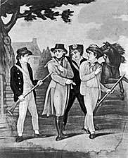 Even before his capture, John André was a notable figure in Philadelphia. After studying military engineering at the University of Göttingen in Hanover, he came to America with the British Army in 1774.7 When the British surrendered their fort in Quebec in 1775, André was taken prisoner and remained in Lancaster, Pennsylvania, at the home of one Caleb Cope until the end of 1776; while there, André shared his interest in drawing with Copes son John. A year later, during the British occupation of Philadelphia, he joined a group of fellow officers in performing theatricals; besides acting, André designed scenery and costumes. He also helped organize "The Mischianza," a weeklong tribute to the departing General William Howewhom Henry Clinton succeeded as commander-in-chief of British forcesthat consisted of a regatta, pageants, mock tournaments, fireworks, and a ball.8 Analysis Both the accompanying exhibition catalogue and George Murrays review of the annual exhibition in The Port Folio announced Kearnys plans to publish an engraving of The Capture of Major André as part of a series of single-sheet engravings, each measuring twenty-four by seventeen inches, "to be selected from the most important and interesting subjects in American history."12 Murray himself was responsible for engraving another work in the exhibition; John James Barralets drawing First Landing of Columbus in the New World (about 1812) was chosen as the first image in the new series.13 Besides celebrating the young nations history, the series was "undertaken with a view to shew the real state of the Arts of Design and Engraving in this country."14 Kearny took subscriptions for his print at his Locust Street address. Although Murray offered criticism of The Capture of Major André, he considered it a "very excellent production," and he intended his comments to benefit the proposed engraving project, in which, of course, he had an interest.15 Murray even praised his fellow engraver Kearny in his review of Sullys painting: "From a knowledge of the talents and laudable ambition of the young artist, who has undertaken the engraving and publishing a print from this picture; we have every reason to believe that the execution will be such as will do credit to himself, the painter, and our country."16 Surprisingly, however, Kearnys print of the Major André painting was never published. It was unusual for an engraver to commission a painting from an artist, exhibit it, advertise subscriptions, and then not publish the engraving to recover his costs.17 Certainly, the reputations of both Sully and Kearny would have benefited greatly had it been released. Murray did not engrave Barralets design of the First Landing of Columbus in the New World either. Apparently, the proposed series of American history prints was never completed, although other paintings of subjects in that sphere displayed at the 1812 exhibition were engraved.18 The Capture of Major André was valued for its American subject matter above other historical paintings in the European Grand Manner tradition that were included in the 1812 exhibition. The visiting Russian diplomat, artist, and author Pavel Svinin (17881839) singled out the work, one of eleven Sully showed at the exhibition, as his "finest painting and the one which best shows his talent."19 And Murray, in his review for The Port Folio, wrote, "This picture is a very excellent production. . . . It is extremely gratifying to the lovers of the fine arts in this country, to see a taste and disposition to encourage historical painting and engraving, by introducing among us a taste for subjects from our own history."20 The portrayal of a Revolutionary War victory of three ordinary Americans over an aristocratic British officer was an inspirational signal to the young republic, which that year had entered another war with England. The didactic message requisite for history painting was clear in The Capture of Major André and was reiterated in the exhibition catalogue, a paraphrase of William Gordons explanation as it appeared in his History of the Rise, Progress, and Establishment of the Independence of the United States of America: Including an Account of the Late War and of the Thirteen Colonies from Their Origin to That Period, first published in New York in 1789.